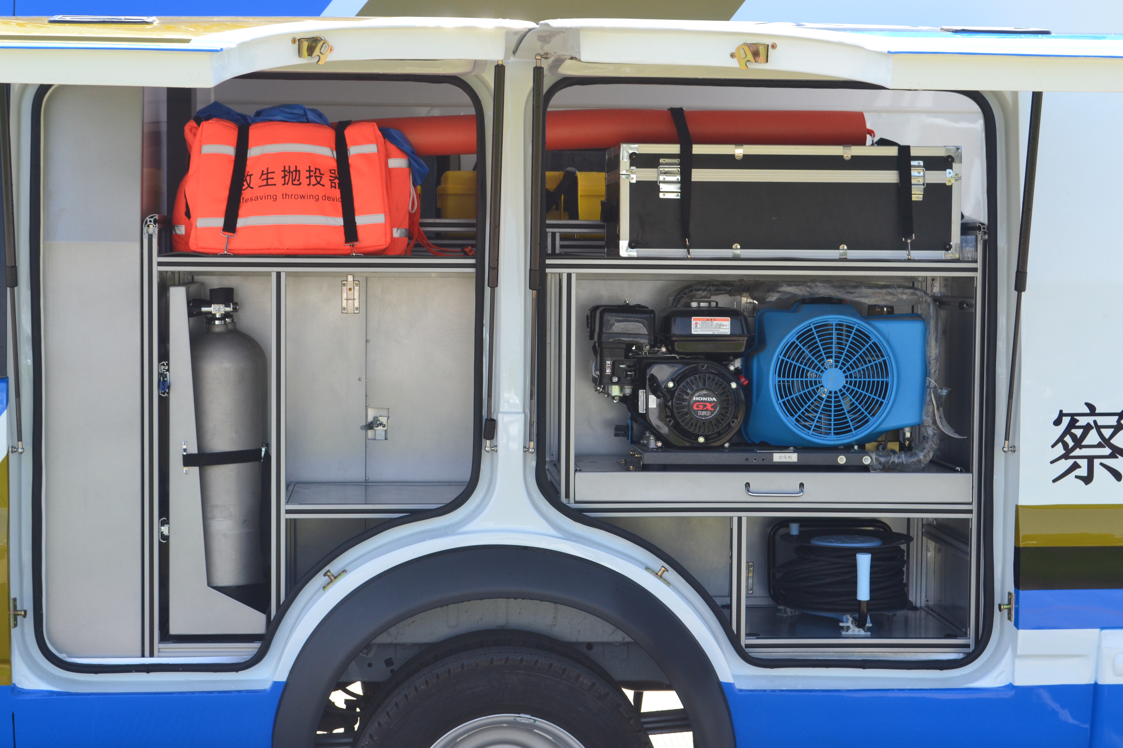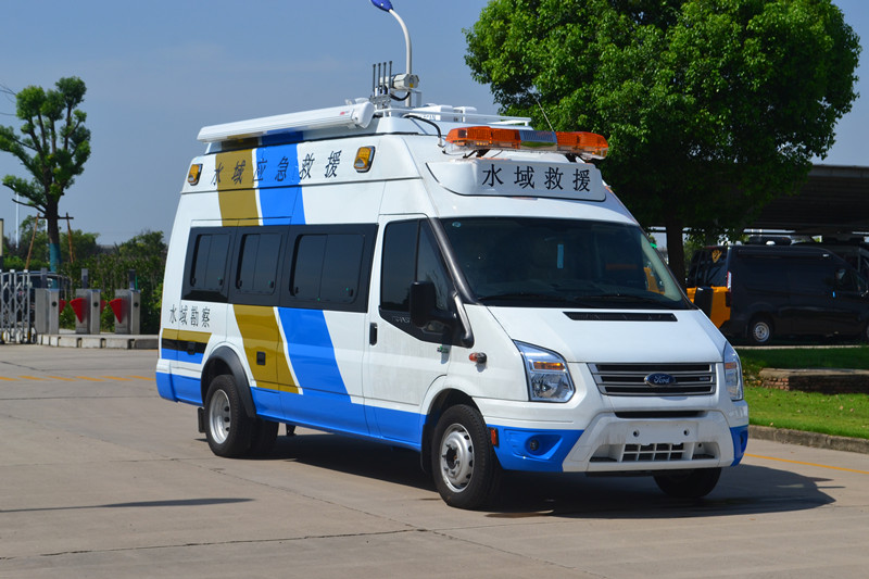 采用江鈴新世代全順加長軸高頂客車改裝,配備了水下救援設(shè)備、圖像采集系統(tǒng)、配電系統(tǒng)、專網(wǎng)通信、指揮系統(tǒng)、照明系統(tǒng)等,主要用于水域現(xiàn)場勘察、營救落水人員等。