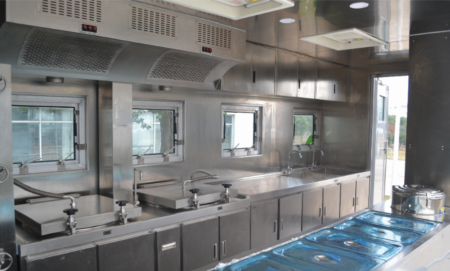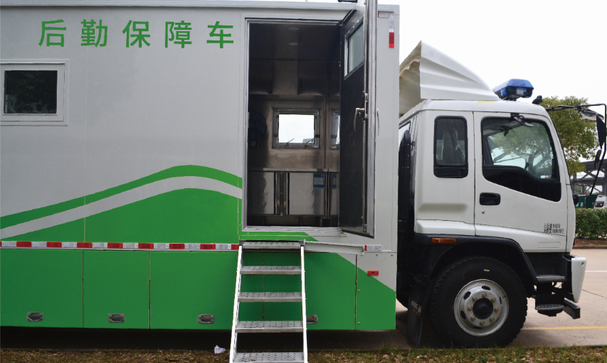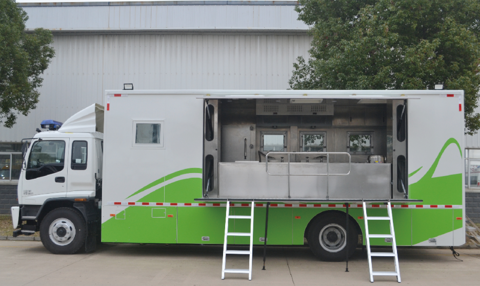 采用重卡底盤改裝,采用開放式廂體結(jié)構(gòu),配備炊事設(shè)備、櫥柜系統(tǒng)、供電系統(tǒng)、供水系統(tǒng)等,滿足搶險救援情況下150-300人的餐飲需求,有效提高餐飲保障能力。