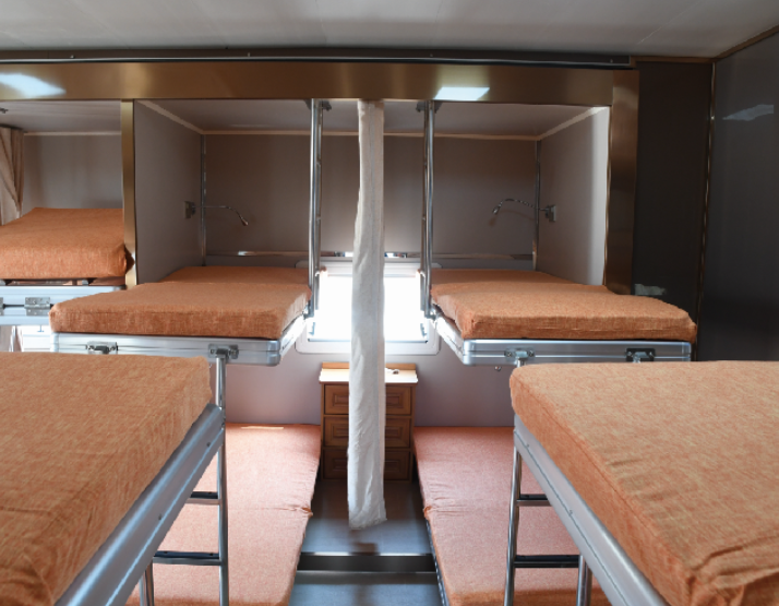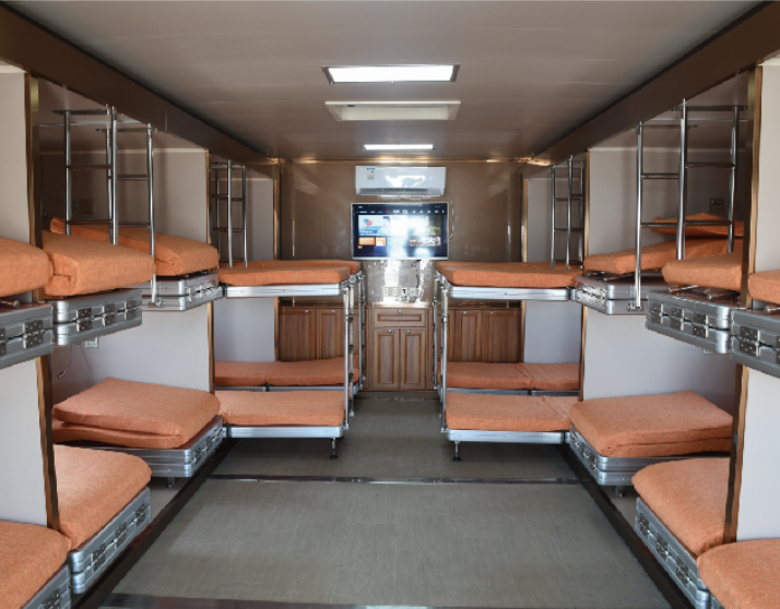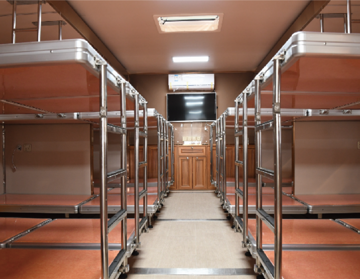 拓展方艙有效提升車內空間,拓展系統采用電動/手動一體式控制。艙內配備折疊單人上下床鋪,可滿足16—40人休息。