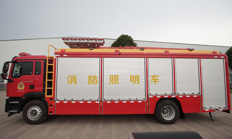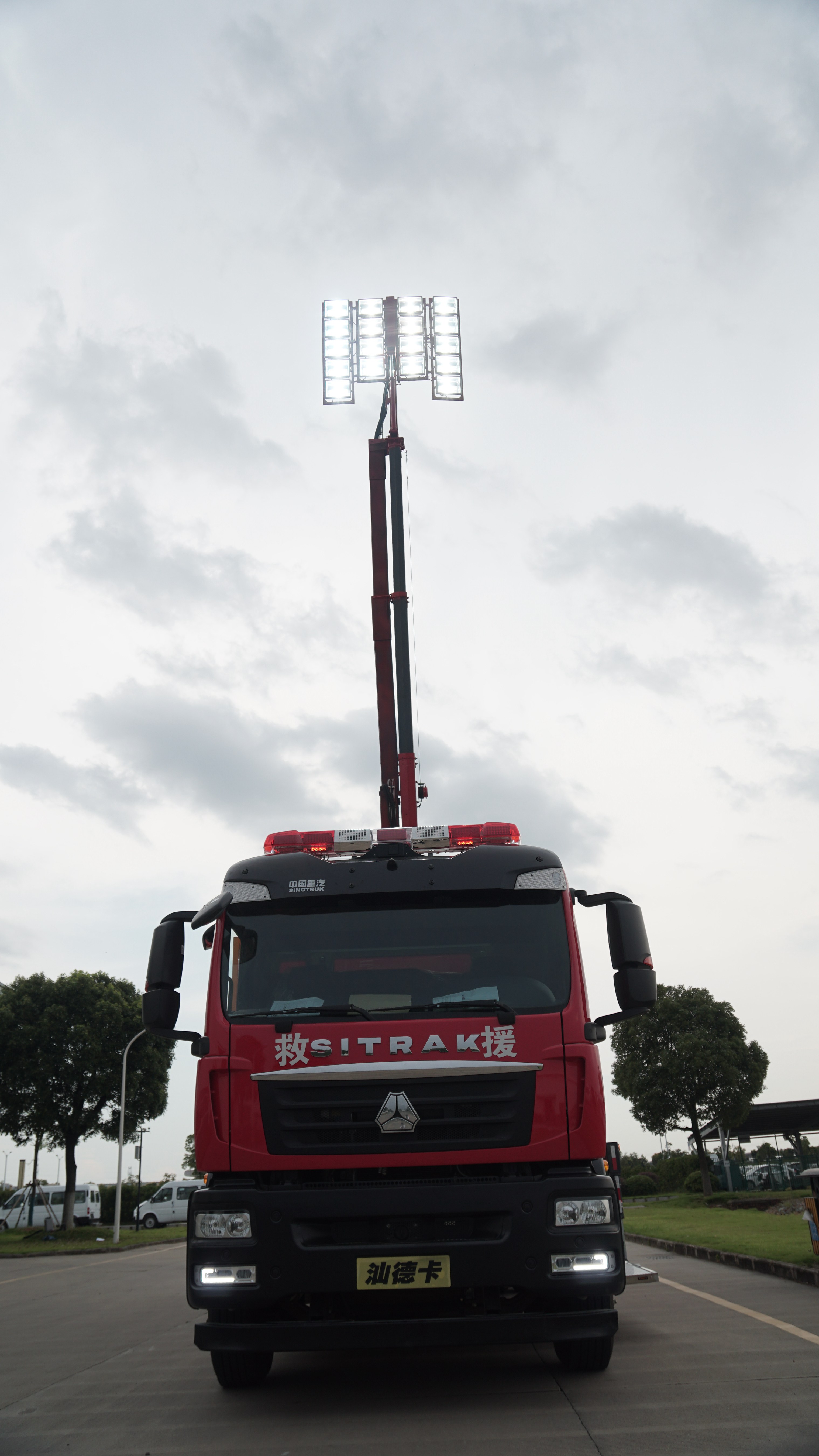 采用重卡底盤改裝,用于消防救援現場提供大范圍、遠距離照明,同時兼作現場應急電源,為通訊、廣播宣傳和破拆器具提供電源。配備了高空舉升式照明系統、大功率發電機組、定制裝備柜、專用消防救援工具等,具有照明高度高、作業范圍大、抗風能力強等優點。
