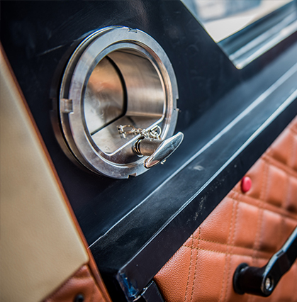 車身采用進口防彈材料制作并采用跳彈結構, 玻璃采用41mm全波防彈玻璃,達到B級防彈要求, 可抵御56沖鋒槍鋼芯彈攻擊。