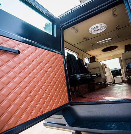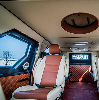 座椅采用“2+2+6”組合方式,座椅及內飾材料采用真皮軟包;加裝空調、暖風、換氣扇等,保證車內環境的舒適性。