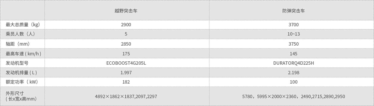 全車四面防彈,車身及玻璃滿足防暴車A級標準,輪胎滿足中彈后行駛30km以上。