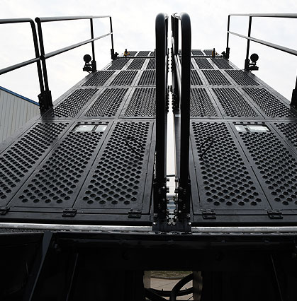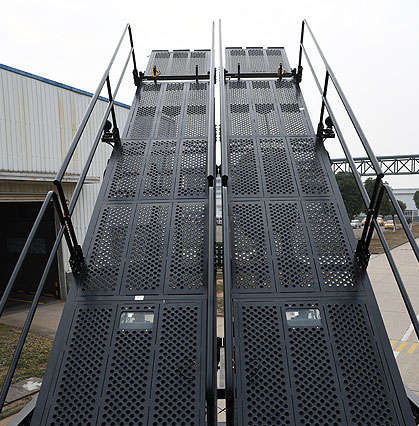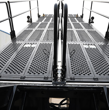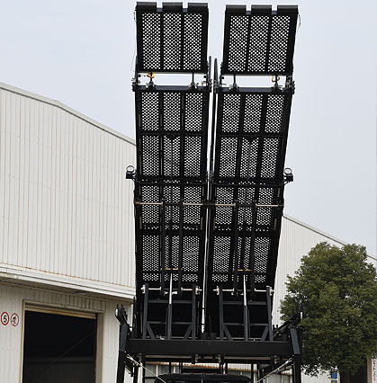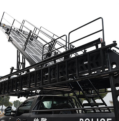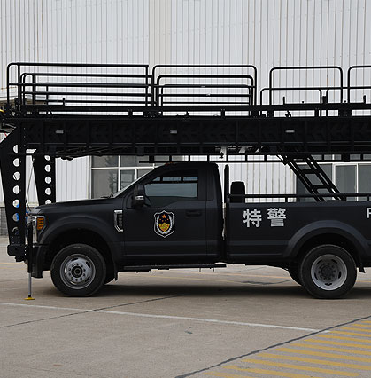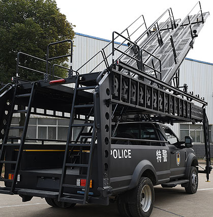 突擊坡舉升到位后,結合戰術梯正前方突擊最高高度可達10.2米,兩側最高7.5米;掛裝越障板后,水平越障跨度可達6米以上,越障高度大于3.5米。