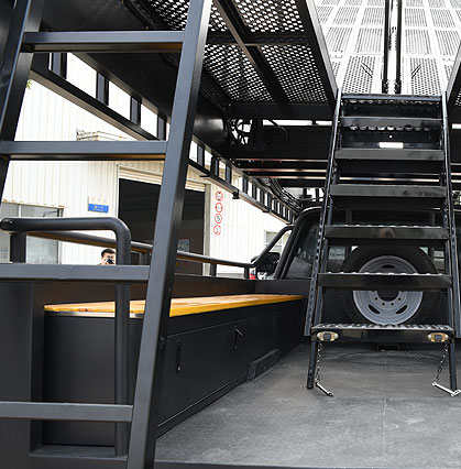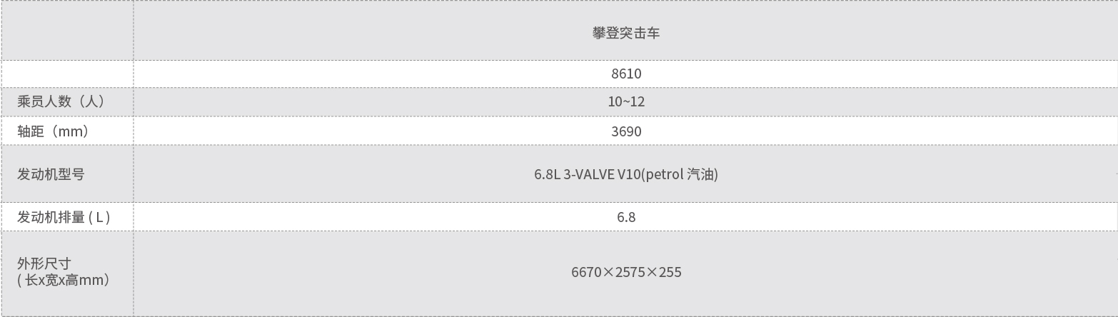 車內可乘坐12人(含正副駕駛),車外兩側安裝伸縮踏板可站立6人,可快速將多名攻擊隊員送達三層樓高度。
