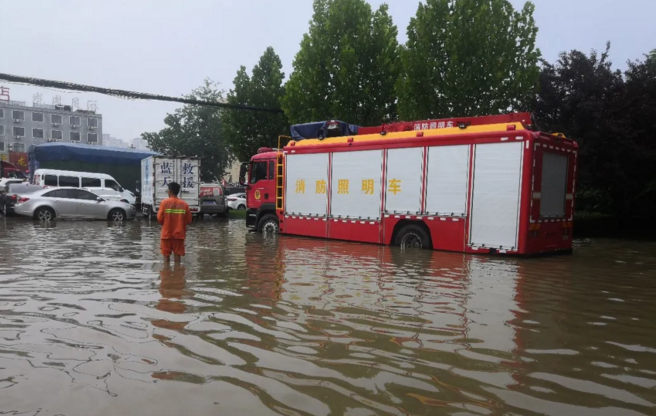 受暴雨影響,河南一些地方已經斷水斷電數日,發電照明車的抵達,可為黑暗中救援現場提供夜間照明、同時可兼作現場應急電源,為通訊、廣播宣傳和破拆器具提供電源,保障救援現場。