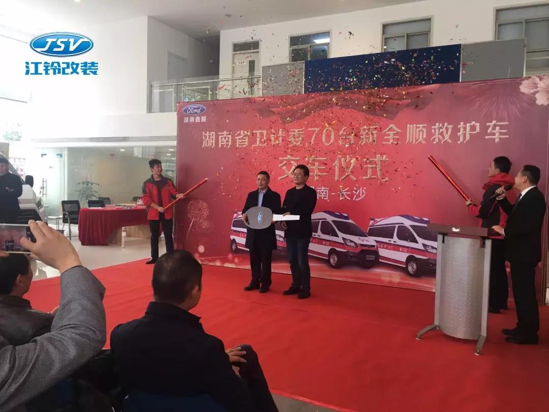 2018年3月13日,由JSV江鈴改裝的70輛新全順救護(hù)車順利交付給湖南省衛(wèi)計(jì)委使用。這70輛車的發(fā)放將全面提升基層單位醫(yī)用裝備建設(shè)水平,改善基層醫(yī)療機(jī)構(gòu)的辦醫(yī)條件,緩解基層群眾健康服務(wù)需求。