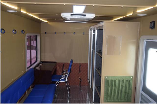 移動警務方艙,又名移動警務室、流動警務室或移動治安卡點方艙。拖車式移動警務方艙在拖掛廂式車底盤改裝而成,廂體采用鋼質加強型骨架配合復合板材,質量輕,保溫隔熱性能好。警務方艙空間設計合理,配備了辦公系統、警示系統、供電系統、監控系統、空調系統等,可滿足駐車車內多人同時辦公、咨詢、現場作業等功能,還可以根據實際需求用牽引車拖掛到特定區域開展工作。